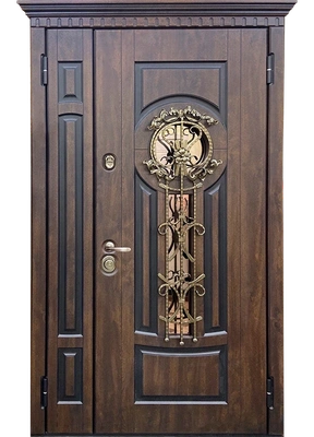 Полуторная дверь с ковкой и стеклом МДФ декоративный наличник Орех каньон уличная