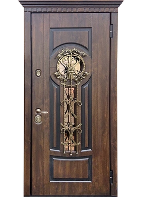 Одностворчатая дверь для коттеджа с ковкой и стеклом МДФ Орех каньон