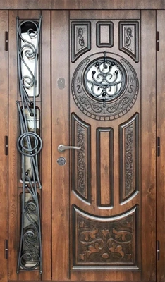 С утеплителем дверь в коттедж декор ковка и стекло МДФ Орех каньон с патиной