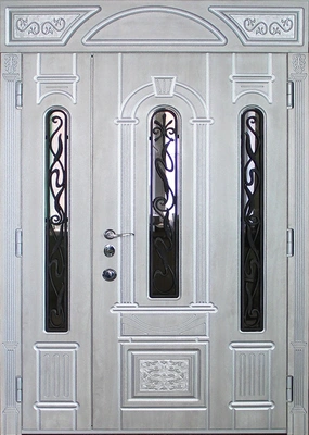 Двустворчатая дверь термо в дом верхней и боковой фрамугами МДФ ковка и стекло