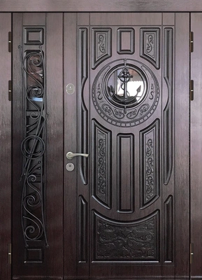 Входная дверь с утеплителем двустворчатая Ар-нуво темный МДФ декор из стекла и ковки