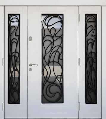 Белоснежная входная дверь непромерзающая с остеклением и декоративной ковкой две створки открывания