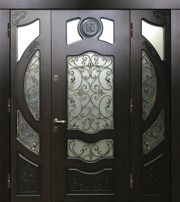 Входная дверь с утеплителем двустворчатая Ар-нуво темный МДФ декор из стекла и ковки