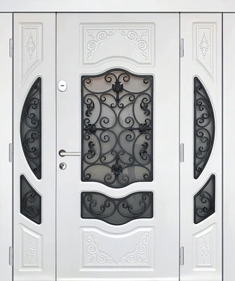 Белоснежная входная дверь непромерзающая с остеклением и декоративной ковкой две створки открывания