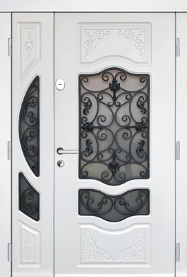 Дверь с двумя створками декор из стекла и ковки Ар-нуво МДФ белоснежный уличная