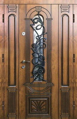 Полуторная дверь в классик Массив дуба состаренный декор из стекла и ковки терморазрыв