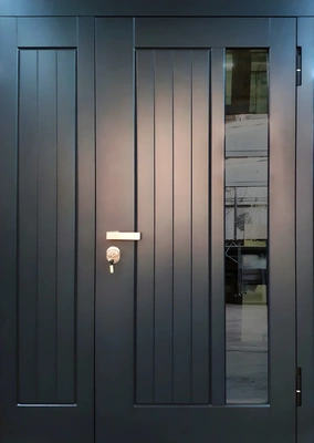 Входная дверь незамерзающая МДФ матовая эмаль Антрацитово-синий со стеклопакетом линейный рельеф модерн