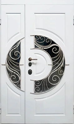 Входная дверь с двумя створками стеклопакет с кованой инсталляцией МДФ Опал термо