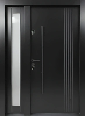 Входная полуторная дверь с остеклением МДФ Чёрный янтарь с бугельной ручкой с терморазрывом