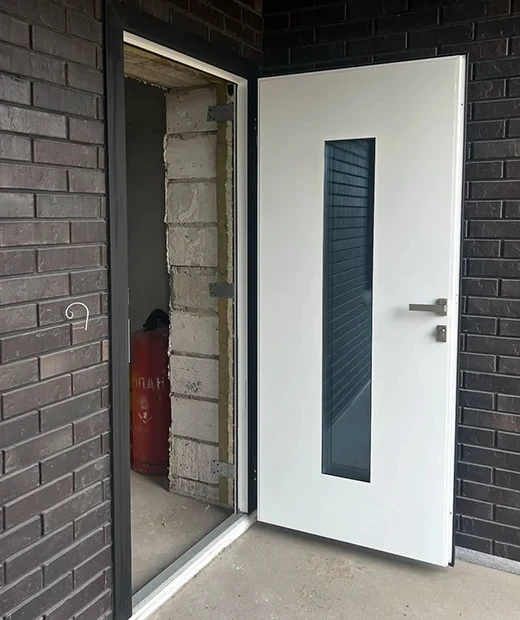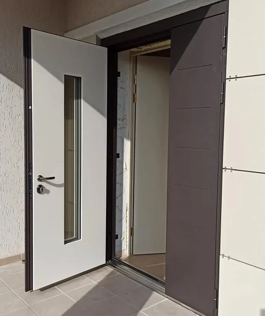 Широкая двустворчатая дверь для улицы напыление RAL 8017 и МДФ Белоснежый