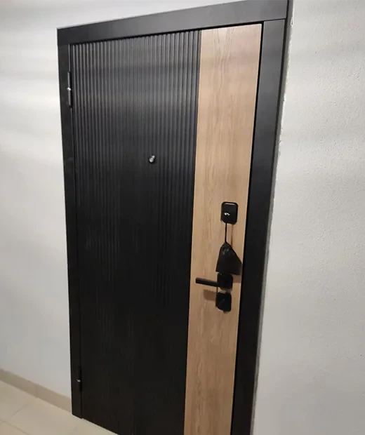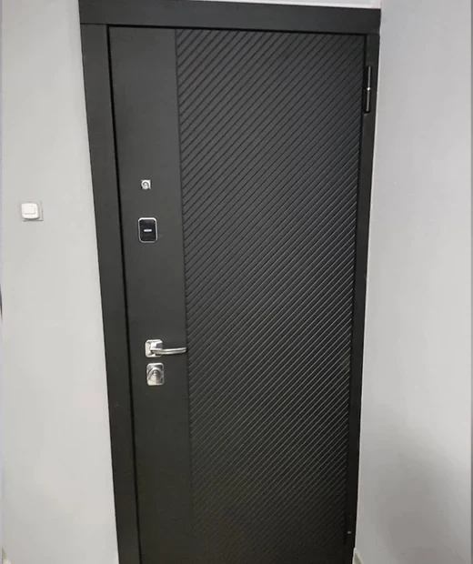 Чёрная входная дверь МДФ декоративные полосы хай-тек