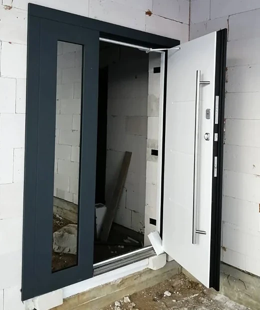 Двустворчатая дверь с длинной ручкой в коттедж RAL 7021 и МДФ белоснежный
